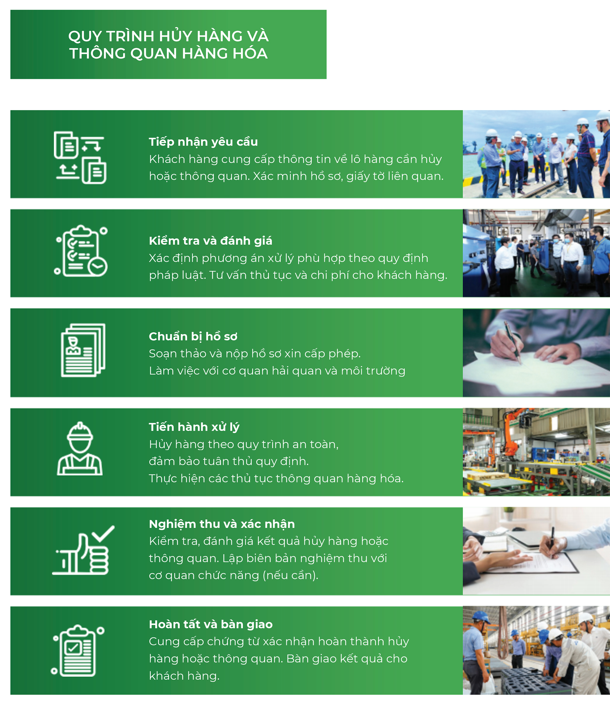 Cung cấp chứng từ xác nhận hoàn thành hủy hàng hoặc thông quan. Bàn giao kết quả cho khách hàng.