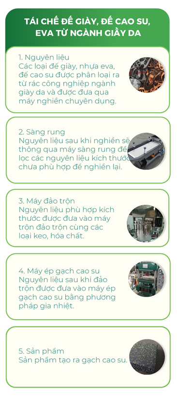 Các loại đế giày, nhựa eva, để cao su được phân loại ra từ rác công nghiệp ngành giày da và được đưa qua máy nghiền chuyên dụng.